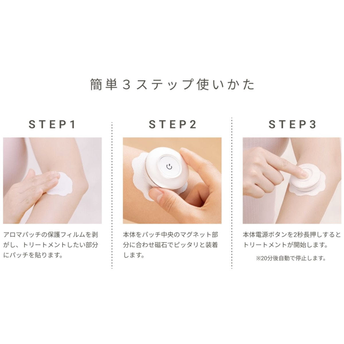 5.肌に貼り付けたアロマパッチに本体を装着する。