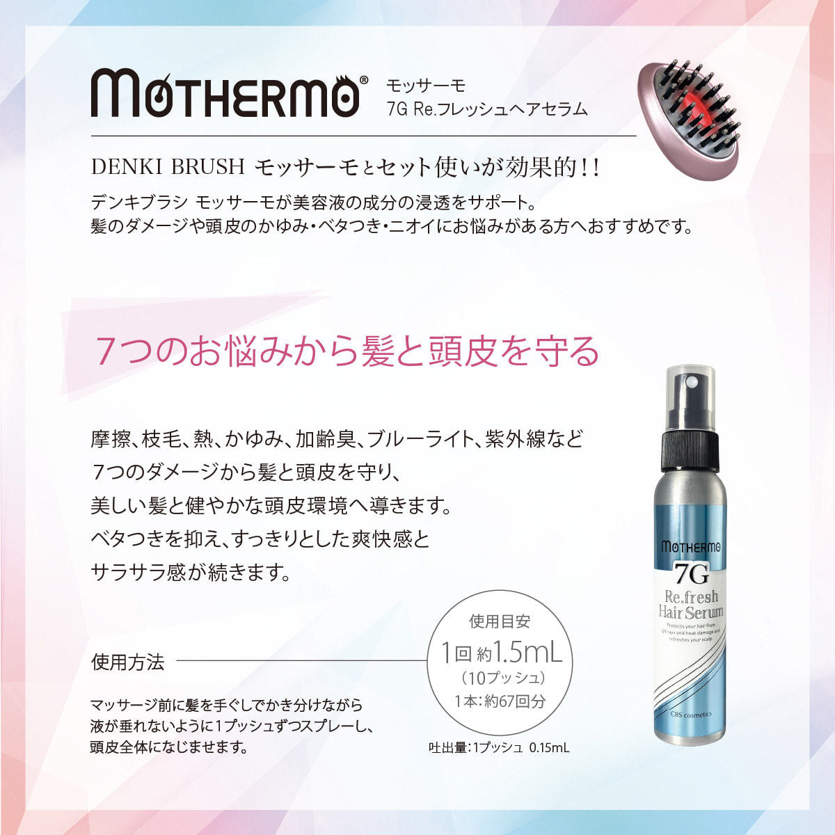摩擦・枝毛・熱・かゆみ・加齢臭・ブルーライト・紫外線など7つのダメージから髪と頭皮を守り、美しい髪と健やかな頭皮環境へ導くセラムです。