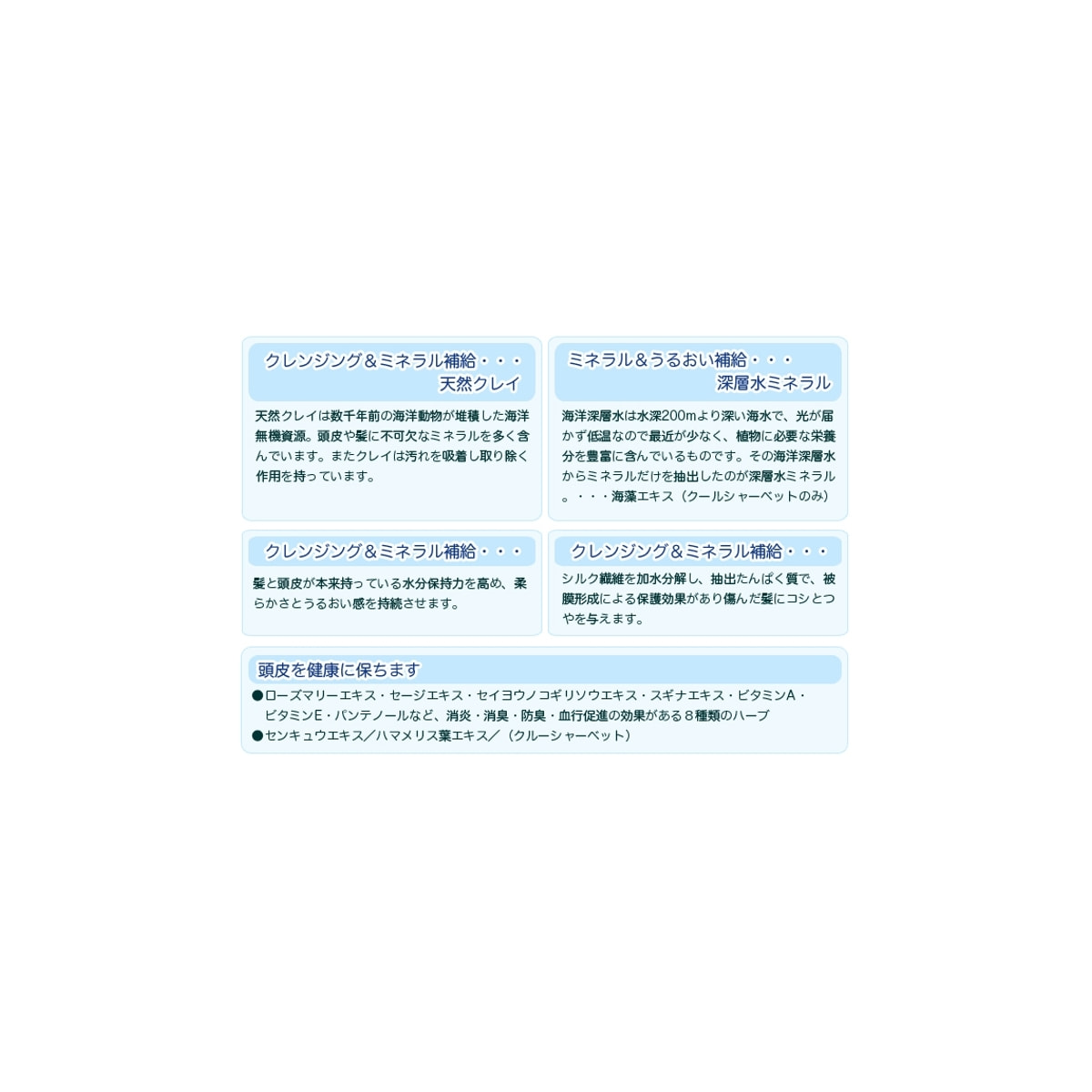 天然クレイが頭皮や髪の汚れを吸着除去し、ミネラルと保湿成分を補給して、しっとりした髪に仕上げます。
